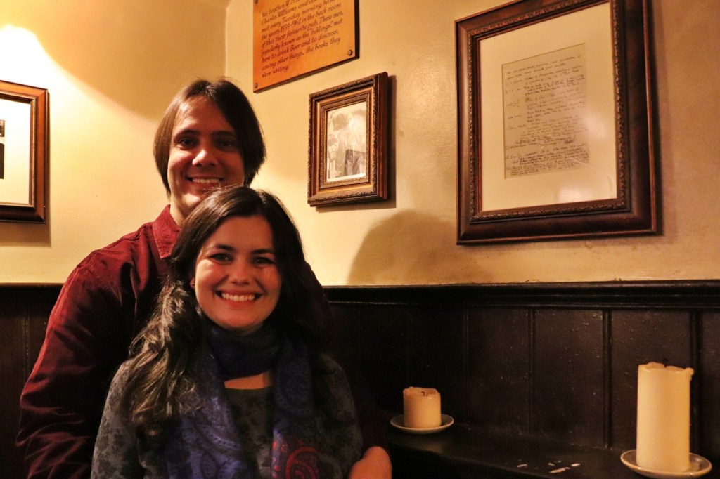 Depois disso fomos até o pub The Eagle and Child, um pub aberto em 1650! Não bastasse isso, era o local onde Tolkien, C.S. Lewis e outros amigos se encontravam toda terça-feira para discutir literatura e os livros que estavam escrevendo ou lendo. Como chegamos cedo (ainda era meio da tarde), o pub estava praticamente vazio e pudemos sentar na mesa que Tolkien costumava sentar.
