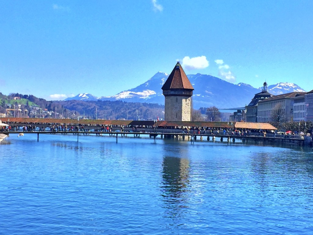 A cidade de Lucerna (ou Lucerne) é absolutamente LINDA, tendo tudo que a gente espera da Suíça: montanhas, lago, bom vinho, bom queijo e bom fondue de queijos! E pra todo lugar que se olha você vai ver montanhas com picos cobertos de neve (mesmo indo na primavera!).