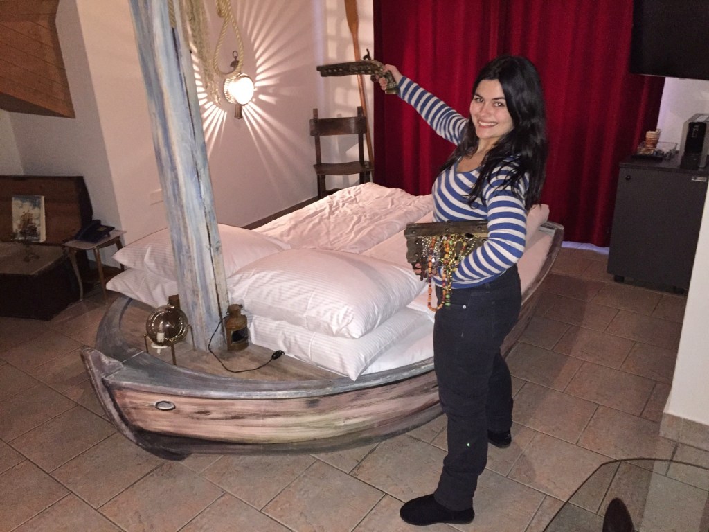 Só escolhemos esse hotel porque a localização era ótima (no meio do centro histórico!) e o preço estava bom. Quando chegamos lá fomos surpreendidos com os quartos divertidos e temáticos. O nosso era tema Piratas e todo o quarto era decorado com baús, pistolas, bússolas, sendo a própria cama um barco. Nós viajamos com um casal de amigos que acabou ficando em um quarto com decoração fazenda hahah. Nos divertimos muito com a decoração do hotel!