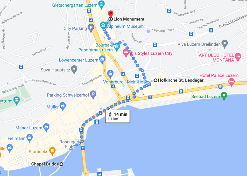 À uns 5 ou 10 minutos dali há o Lion Monument, um leão esculpido em homenagem aos Guardas Suíços que morreram defendendo o Rei Louis XVI durante a Revolução Francesa.